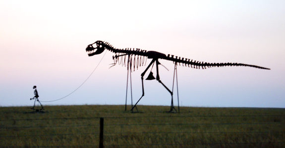 恐龙牧人牵着他的恐龙在散步(南达科他州)