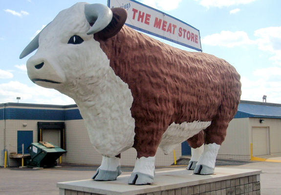 一头巨大的牛站在一家肉食店的门口(明尼苏达州)
