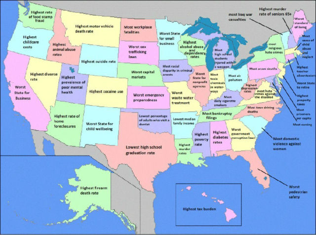 有名的州包括纽约州、加州、德克萨斯州、华盛顿州、佛吉尼亚州等;而相对来说最不有名的有路易斯安那州、密西西比州等。