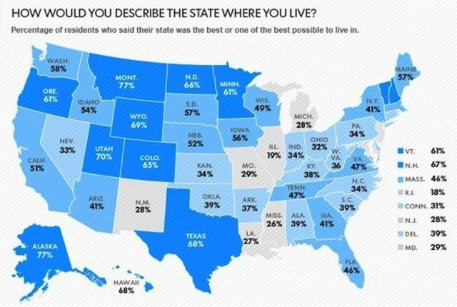 颜色越深表示越想搬走。中部的伊利诺伊州民众对于本州不太满意。
