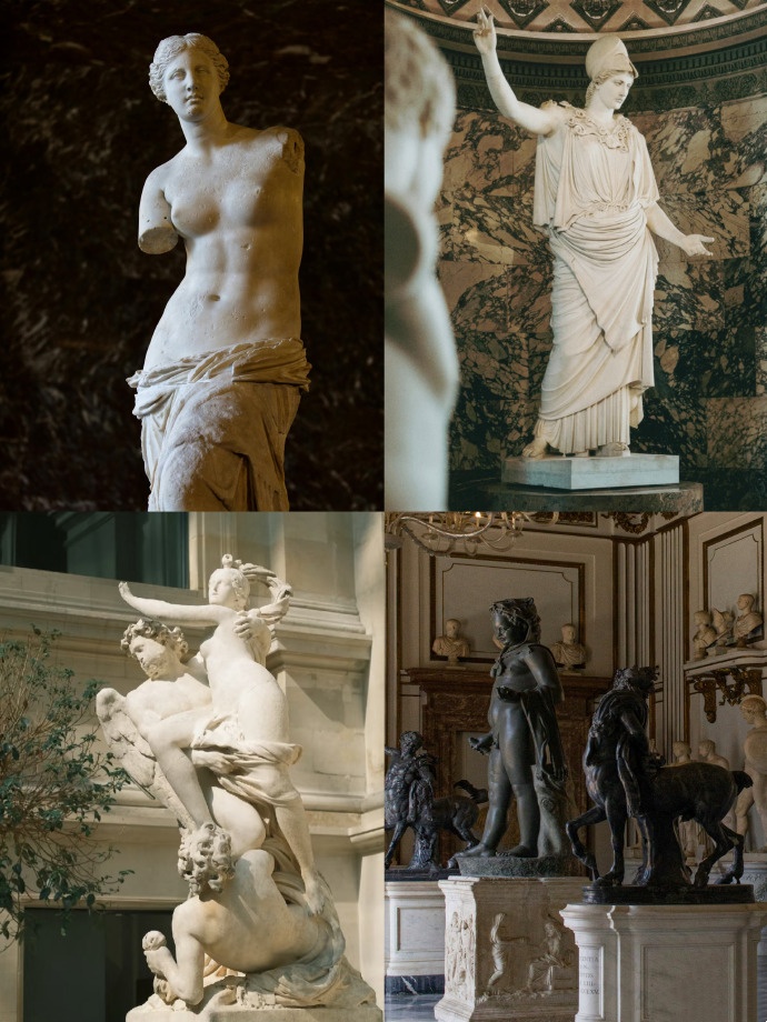 古埃及艺术馆建立于1826年,早于东方艺术馆,共有23个展厅,收藏珍贵文物达350件。这些文物包括古代尼罗河西岸居民使用的服饰、装饰物、玩具、乐器等。这里还有古埃及神庙的断墙、基门、木乃伊和公元前2600年的人头塑像等。 古希腊与古罗马艺术馆 古希腊与古罗马艺术馆建成的时间更早,大约在1800年向公众展出,其藏品更多,大约有7000余件。古希腊与古罗马艺术馆的藏品以法国王室的收藏品为基础。拿破仑率领的法军在意大利获胜后,劫获了许多意大利的古代艺术品,将之运回法国充实卢浮宫。后来,法国又从各方面不断丰富里面的收藏品。雕塑在该馆内占有主导的地位,雕塑品包括大理石、铜、象牙等。在古希腊和古罗马艺术馆中,有两件备受世人赞美的最瞩目的不朽作品,一是“萨姆特拉斯的胜利女神”,二是爱神“维纳斯”。