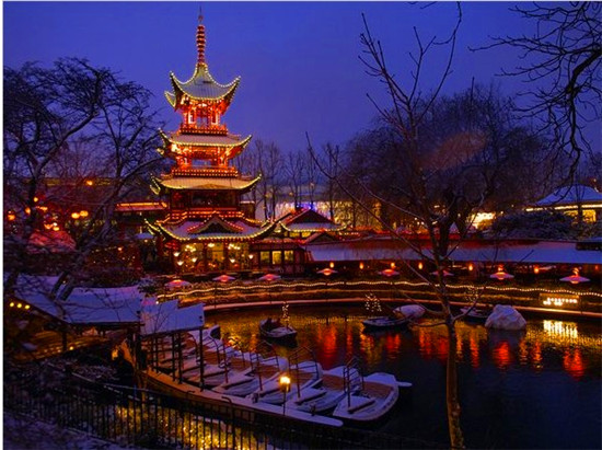 每年11月11日至12月30日期间,丹麦于1843年建立的趣伏里游乐园由一名蒂凡尼(著名珠宝品牌)设计师设计成梦幻般的“快乐之园”。园内许多建筑物都由明亮的节日彩灯装饰着,而日本宝塔餐厅是其中之一,它是蒂沃利湖上一个很受欢迎的餐厅。除了观赏位于音乐厅附近的亚洲区之外,游客还可以乘坐1914年建造的过山车,在闪闪发亮的天空之中穿梭;并且可以享用格拉格酒及苹果饺子,驱走冬日的寒意。
