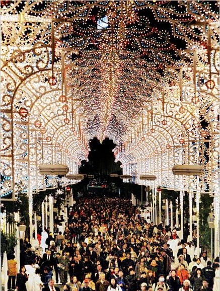1995年神户大地震后,意大利向日本支援了成千上万只手绘灯泡,它们被安装在复杂的哥特式建筑物内。在12月1日至12日,四百多万狂欢者聚集在Higashi-Yuenchi公园附近,庆祝日本强大的适应力,延续夜光节的传统。