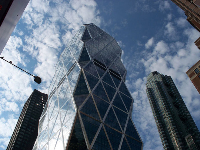 于2004年投入使用的赫斯特大厦是由英国建筑师诺曼·福斯特设计的,是赫斯特出版公司的总部。大厦由1928年竣工的六层大楼--原赫斯特总部延伸而成, 共有46层。其三角的设计风格和石质的正面六层底座形成鲜明的对比。这是美国自2001年9.11后破土的第一栋摩天大楼,也是纽约的第一栋竣工的绿色办 公大楼。