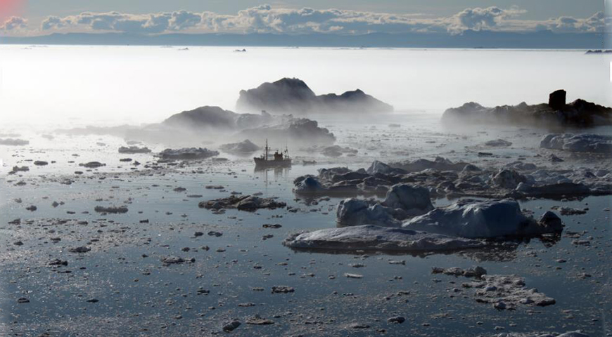 冰河航行 格陵兰岛萨特。一只渔船在冰山间蜿蜒航行。有个词叫“披星戴月”,我可以说他是“披霜戴雾”么?太美了……