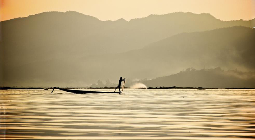 缅甸茵莱湖。渔夫靠两只脚来操控小舟,一只脚用来划船,另一只脚则用来保持平衡,双手腾出来打鱼。想跟渔夫说,你全情在江中打鱼,而你打鱼的全情装饰了看风景人的梦。