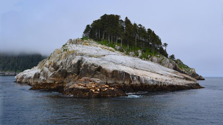 摄于阿拉斯加州的基耐峡湾。基耐峡湾岩石无数,这是其中一块。石脚海狮齐集,顶部树木葱茏。再看树木后隐藏的浓雾,无以言表,难以忘怀