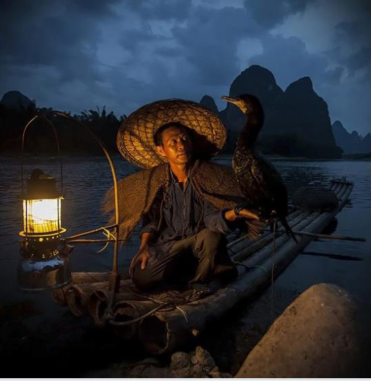 摄于中国一个名为兴坪的小渔村。蓑衣斗笠,江中渔火。渔夫正训练鱼鹰在河湖中捉鱼。
