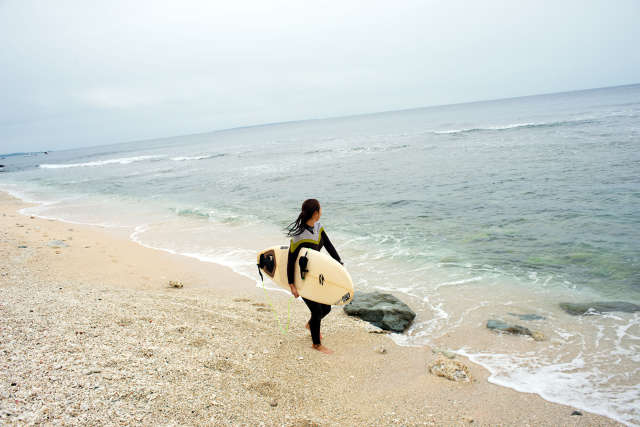 在石垣,一名冲浪健儿查看潮水是否适合冲浪