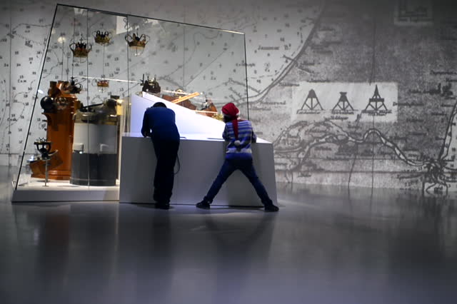 丹麦艾尔西诺航海博物馆的一场展览中,背景的地图在移动。
