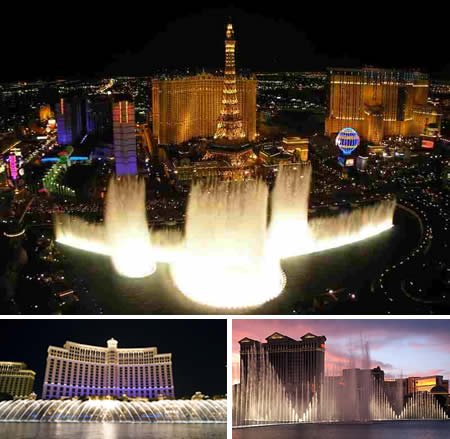 百乐宫喷泉位于赌城拉斯维加斯的百乐宫大酒店前,是集灯光,音乐,舞美设计于一体的大型观赏性喷泉。整个喷泉坐落在3.6公顷大的人造水池中,每当音乐响起,声音的讯号转化为电流的波动,进而控制喷泉出水的形状,呈现出伴乐起舞的美景。喷水口分布在周围的建筑,街道上,可以组织表演宏大的喷泉场景。每天的下午和傍晚每半小时,晚上8点到12点每一刻钟,都会有喷泉表演。