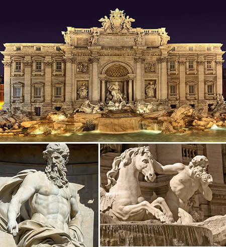 这座长25.9米,宽19.8米的喷泉建筑,拥有意大利最为经典与完美的雕塑。整个雕塑呈左右对称,在中央立有一尊被两匹骏马拉着奔驰的海神像,海神像是在1762 年雕刻家伯拉奇的设计。在海神的左右两边各立有两尊水神,右边的水神像上,有一幅“少女指示水源”的浮雕,而浮雕上面有四位代表四季的仕女像。这座喷泉之所以出名,源于一个美丽的传说:背对喷泉从肩以上抛一枚硬币到水池里,就有机会再次访问罗马。
