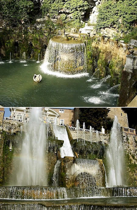 卵形喷泉位于百泉小路的左边,是单独的一个小院落。喷泉的中间是一个半圆形的平台,可以使水流呈弧形流下,卵形喷泉也由此而得名。它是由意大利文艺复兴时期,著名建筑师皮尔若设计,1567年建造完成。卵形喷泉所在的别墅于2001年,入选联合国教科文组织评选的世界遗产名录。