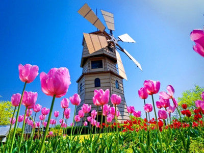 荷兰被称为“欧洲花园”,每年3月~5月,郁金香相继绽放,红、黄、粉、白……朵朵鲜花争芳斗艳,在古老的风车下展现着独特的风姿。远远望去,一畦畦花田宛如一道道彩虹,将人带入童话世界。