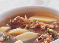 火腿即火肉,用猪腿腌熏而成。《遵生八笺》中说:“火肉,以圈猪方杀下,只取四只猪腿,乘热用盐,每一斤肉盐一两,从皮擦入肉内,令如绵软,以石压竹栅上,置缸内,二十日次第,三番五次用稻柴一重一间重叠起,用稻草烟熏一日一夜,挂有烟处。初夏水中浸一日夜,净洗,仍前挂之。”火腿鲜笋汤在清代中叶,是高档食品,《调鼎集》上说:“上席……冬笋火腿汤。”明清时食火腿鲜笋汤是江南食俗。火腿与春笋合烹,其滋味特佳,扬州人称“一啜鲜”,故宝玉急急地端起来就喝,被热汤烫了嘴。