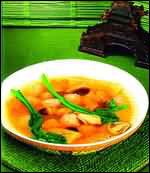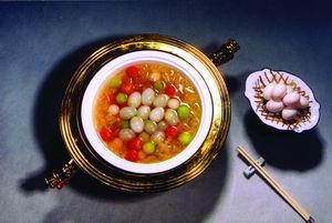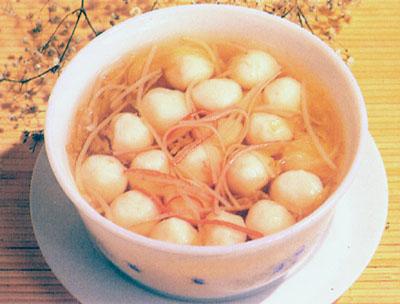 鸡皮虾丸汤,虾肉嫩白色,是海中之宝,高蛋白低脂肪,可补肾壮阳,健脾化痰,益气通乳。用其做汤口味清鲜,虾肉脆嫩。特别是丸子做成白、绿两色,颇有特色。从主料、配料看,这道菜有滋补功用。