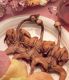 将鹅掌及鸭舌煮熟,剔骨,用鸡汤加盐复煮,捞出后用香糟汁或糟油糟食。