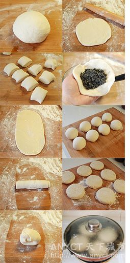面团材料:面粉300克,温水160克,干酵母4克,碱水适量(约60克/个,约8、9个)