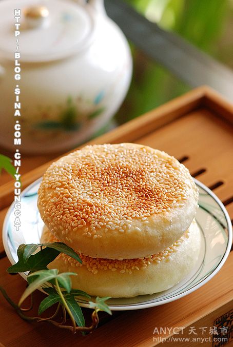 11、取平锅,在锅底刷上一层薄油,微火,将饼坯放入(芝麻面朝下),盖上盖,待饼完全发起,芝麻面发黄后,翻面,盖上盖再焖烤至此面发黄即成。