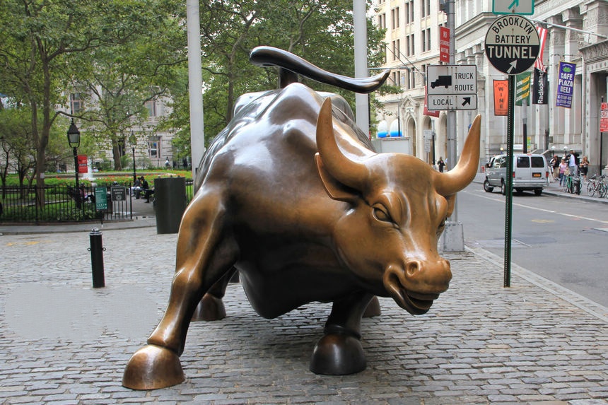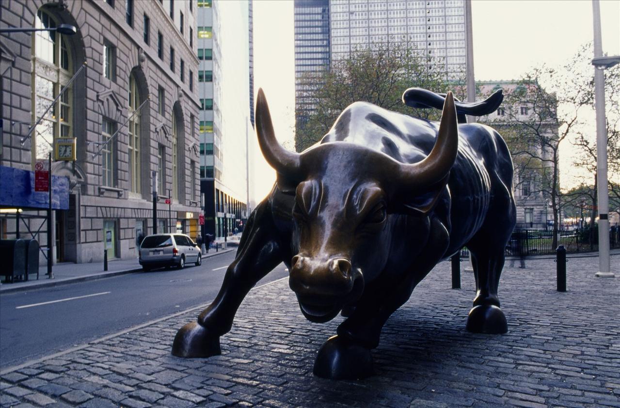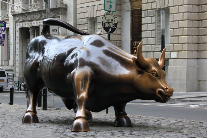众所周知,华尔街的标志是一座身长5米、体重6300公斤的铜牛塑像。设计者迪莫迪卡最早为它挑选的立足点是纽约证券交易所门前的人行道。当时,为了保证铜牛的安全,警察每晚8时在铜牛周围巡逻察看。当人们第一次看到这个身体健硕、鼻孔发光的庞然大物时,都被它浑身透着的“牛”气震住。不过,铜牛还是被搬到与华尔街斜交的百老汇大街上安了家。如今,它已成为“力量和勇气”的象征,似乎只要铜牛在,股市就能永保“牛”市。
