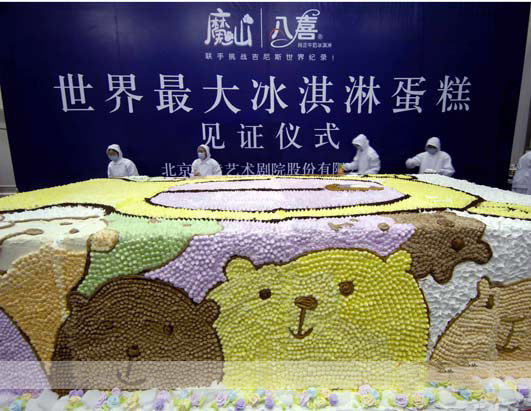 北京的八喜冰激淋公司在2006年1月16日制造了这个世界上最大的冰激淋,它有15.75英尺长,9.84英尺宽,3.28英尺高,重达17637磅。
