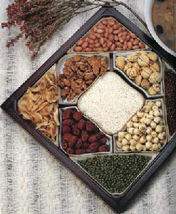 说明:此为清宫食疗秘方。茯苓,《神农本草经》列为上品,说它“久服,安魂养神,不饥延年“,是古代医家常用的益寿药。现代研究证明,茯苓主含茯苓聚糖、茯苓酸、卵磷脂、组胺酸、麦角甾醇等,具有镇静和降血糖作用。茯苓聚糖能增强人体的免疫功能,提高机体的抗病能力,并有较强的抗癌作用。莲子,《神农本草经》列为上品,说它“补中养神,益气力,除百疾,久服,轻身耐老,不饥延年“。芡实,《神农本草经》列为上品,说它主治“湿痹,腰背膝痛,补中,除暴疾,益精气,强志,令人耳目聪明,久服轻身不饥,耐老”。