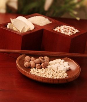 说明:方出《清太医院秘录医方》,是一首食疗保健,健脾益气方剂。方中山药、莲子、白术、芡实、茯苓均为健脾益气佳品,其中芡实兼有固涩之功,茯苓兼有利湿之效,一固一利,固正气利湿邪,颇有配伍之妙。现代研究表明茯苓(见前面)、白术、山药、莲子可提高人体的免疫功能,其中山药可降血糖、降血脂,而莲子、芡实尚有抗癌作用,可见本方养生益寿抗衰作用并非一般。