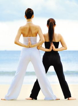 第一式:向上拉伸。双手手指交叉相握,掌心向上,踮起脚尖,全身尽力往上拉升,瑜伽式的腹式呼吸十次,即吸气时肚子外鼓,呼气时收腹,这样腹肌也能很好地参与运动。