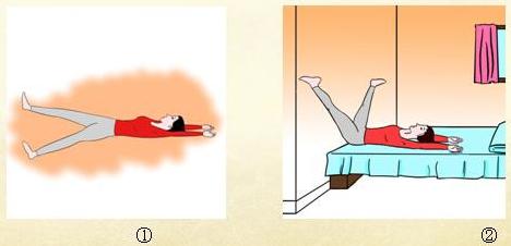 “横位拉筋”有两种姿式:①人平躺在床上或地上,两腿尽量向两边水平展开拉10分钟,这需要别人帮助拉开腿。②仰卧在床上,双脚朝上,臀部和两条腿都贴在墙上,双脚尽量分开,如同英文字母V。