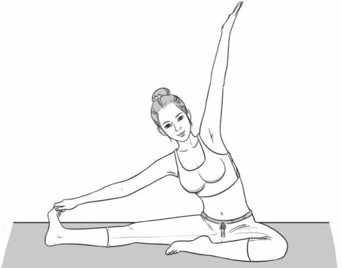 面硬一点的床上、或就在地上铺块毯子,坐下来,把右腿伸直,左腿弯曲平放在地面上,左脚心贴在右大腿的内侧。然后身体向弯曲的左腿方向扭转,右手去抓右脚尖,而左手臂向天空的方向伸展,尽量使身体保持在一个平面内。