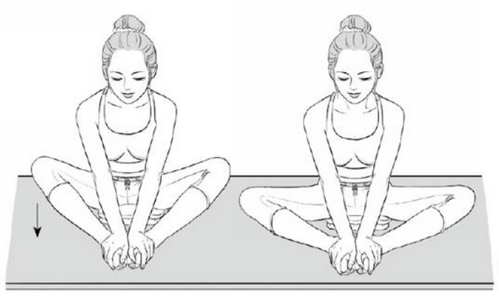 坐下来,屁股下用一个折成两个手掌厚的毯子垫一下。然后曲膝,使脚心相对,脚掌并拢,脚跟尽量靠近下身。双手抓住脚尖,膝盖向两侧打开,尽量往地上贴,这就是“蝴蝶式”了。做这个动作的时候,脊背要挺直,双膝有节奏地向两边地板振动。