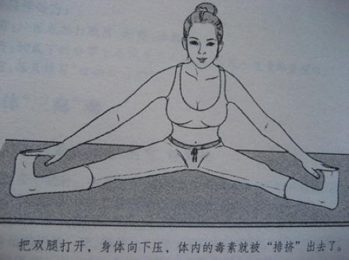 坐在床上,右腿向前伸直,左腿弯曲平放,双手交叠,压在大腿根部,沿着大腿内侧肝经的位置,稍用力向前推到膝关节的,反复推动,四五十遍,然后换另一只腿同样的手法。可以隔着衣服,如果是在皮肤上的话就涂些润肤油,效果更好。每晚推一推,疏肝理气,活血化瘀,去肝火,保养妇科,改善面部气色。