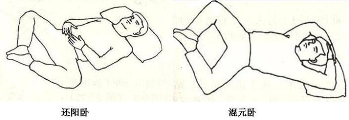 混元卧:把还阳卧再提高层次的练法是混无卧-仰卧,两脚心相对,腿似环,两手重叠或交叉轻轻的放在头上,手心对着头顶百合。这个姿势既能补肾气又可放松头部,对失眠、神经衰弱有较好的治疗效果。上面两臂围成一个圈,可以使肾气不往生殖器上走,而是拉到中脘的深处;下面两腿围成一个圈,有利于周身气血沿腿循环到身体的当中。