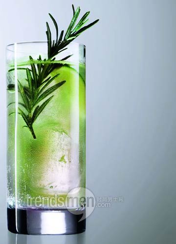 把黄瓜片放在杯底,挤出青柠汁至其没过黄瓜,插入迷迭香,往杯中加满碎冰,再加入5 盎司金酒,4 盎司汤利水,最后加适量苏打。这款酒在金汤力的基础上加迷迭香和黄瓜创造了新的口味。