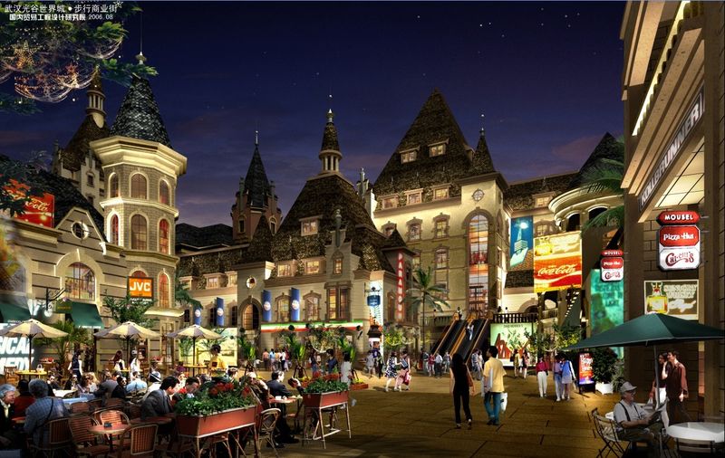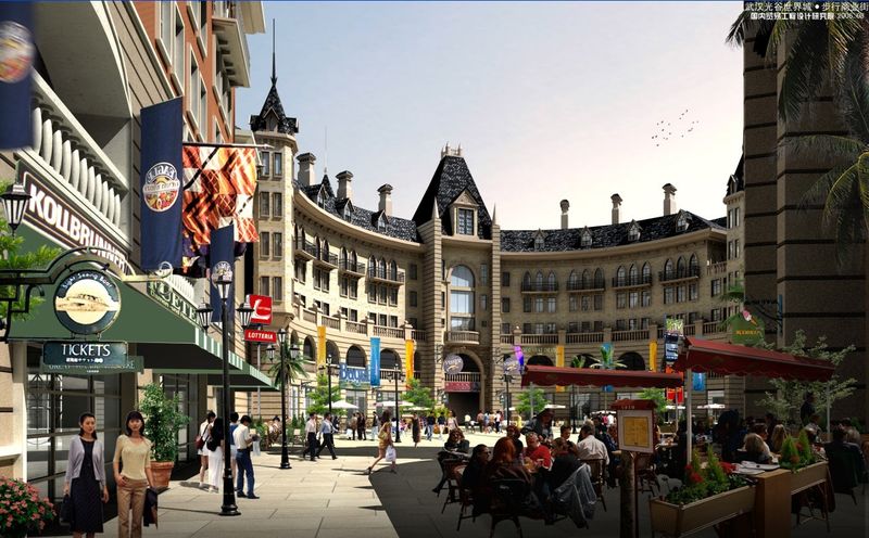 图为光谷步行街3期计划打造的四大广场之一,杜塞尔多夫广场。杜塞尔多夫广场定位为一座酒吧文化广场,3-5层的复古建筑,广场上花车、景观树、音乐喷泉等营造出浓郁的酒吧文化气息。