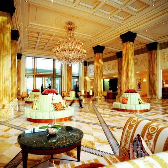 “More Is More”,酒店的广告语异常高调张扬,一如范思哲服装的风格。这里极尽奢华之能事,金碧辉煌、性感耀目,大堂里悬着705千克的枝形吊灯令人眼花缭乱,欢迎来到范思哲的宫殿。