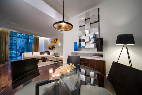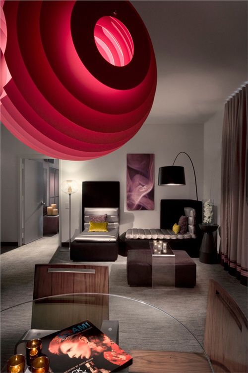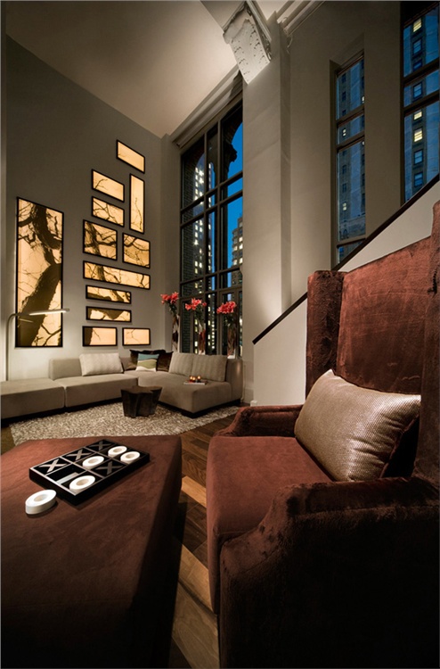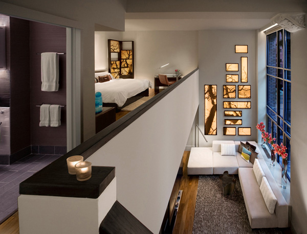 纽约 W 酒店的 Wow 豪华套房极具特色,双倍挑高令人印象深刻,设有一间二楼卧室,黑色硬木地板,抽象的青铜咖啡桌,灵感源自印度盛水容器的定制吊灯,以及来自 Farmboy Fine Arts 的背光压克力板。这些板上有形状大小各异的抽象树形图案,贴在套房的二楼墙壁上,构成迷人的图案,使人很快注意到垂直高度。