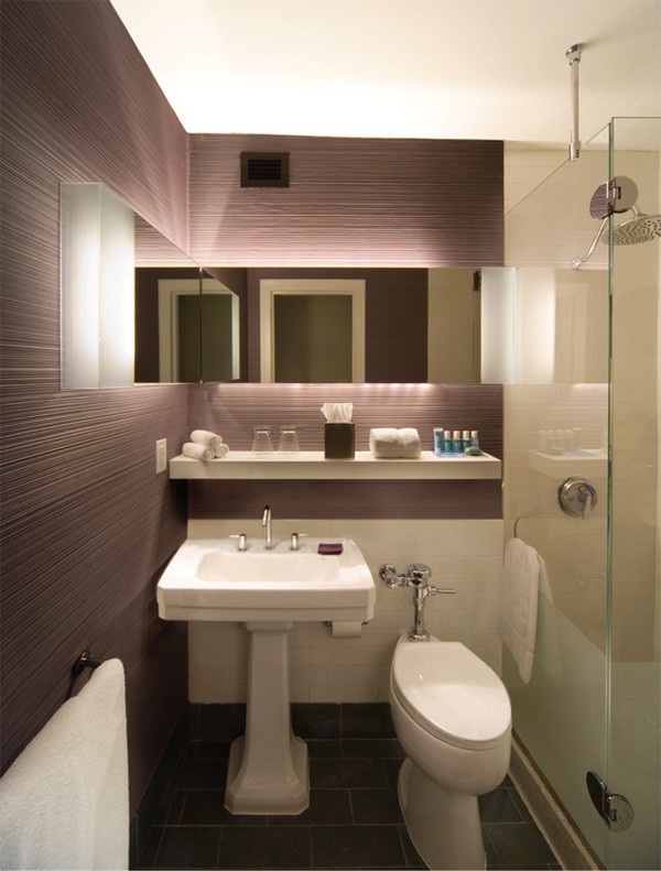 浴室的新设计元素与房间里的那些形成了呼应,让空间感觉上更为宽敞开阔。茶紫色墙面材料加上了横向深槽,给人以立体质感,传统的浴帘换成了干净的玻璃门,让浴室给人一种明亮和宽敞的感觉。