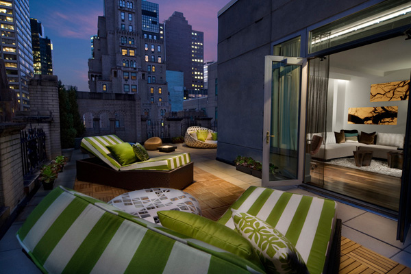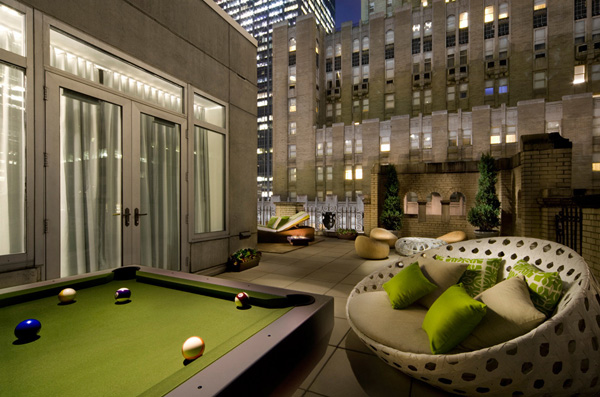 纽约 W 酒店的 Extreme Wow 套房是感受一次创新城(新城博客,新城新闻,新城说吧)市体验的终极去处,独特的体验式环境布置,饱含着天马行空的创造力,令纽约的压力和紧张烟消云散。套房带包围式露天平台,城市美景在面前一览无遗,吸引着客人们来到这个世外桃源,调调鸡尾酒、玩玩游戏,或者舒缓身心。地上铺有柚木地板,而家具都是精挑细选,如超大号坐床、外包野生雪松木的椅子、柚木框组合家具、靠背躺椅和桌球台,这个露天平台提供了一个多功能环境,非常适合放松、游戏或娱乐。