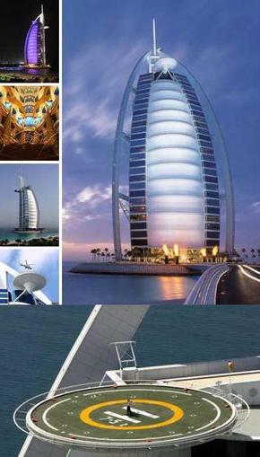 阿拉伯塔酒店坐落在朱美拉海滩上一座高280米的人造小岛上,酒店共有60层,高321米。酒店建设历时5年,其中有3年用于建设这个人造小岛,于1999年正式对外开放。酒店最有特点的是一个圆形的直升机场,老虎-伍兹曾花费100万美元在此打高尔夫。