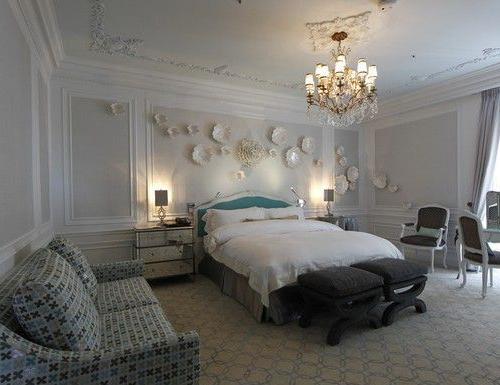 房间的门厅摆设着Tiffany经典蓝的玻璃杯,墙上是手制的银色挂饰,入口处的挂饰让人联想起Tiffany的经典婚戒设计。房内还有珠宝镶嵌的镜子,银色的餐桌,Tiffany蓝的床头板等。客厅的壁炉映衬着天花板到地面的窗户,从这里可以看到纽约的第五大道和中央公园的风景。餐厅的设计就像Tiffany的蓝盒子,细节中夹杂着皇室感的设计。