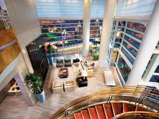 布置:这间套房共有四间卧室,6间浴室,两个餐厅,整整占了16层一层空间。你的眼球会被室内陈设吸引:一个个海枣,一块块蛋糕,以及摆设在升起的绿色大理石浴盆上的小四件。