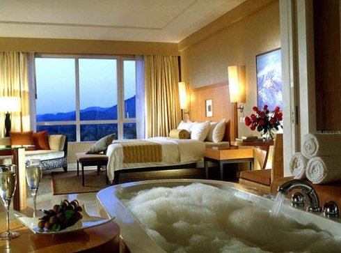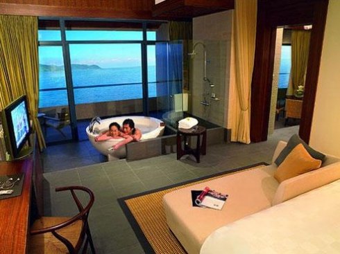 这是希尔顿酒店豪华海景套房的浴室。开放式浴室,圆形浴缸,极至海静。最完美的享受,感觉很浪漫。