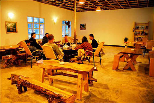 这是几个年轻人筑梦的地方。丹巴庄园的铺陈摆设充满了十足的个人气质:墙上、屋角摆放着几幅放大的照片,照片的相框非常别致,是用木头手工雕制而成的。沙发和茶几也全是木制的,茶几给人的感觉就是将一截圆木直接剖成了两半,平的一面经过加工变成了茶几的表面,上面树的纹路依旧清晰可见,沙发上铺着叫不出名的动物皮毛,坐上去暖暖的。