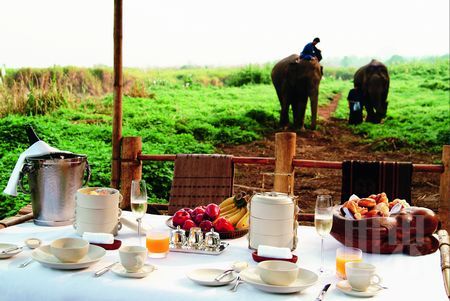 期盼的拂晓之际终于到来,我们乘坐着复古的路虎汽车抵达了酒店的最高点,伴着美丽的日出,欣赏河水与群山在晨光中倾泻得柔美。与此同时,金三角四季帐篷酒店的主厨正在现场烹调让味蕾彻底满足的早餐盛宴:当地的特色咖啡、特别制作的糕点和水果……而在不远处,一群大象也在享用着它们丰盛的早餐:青草、菠萝、木瓜、香蕉,好奇的我更在工作人员的带领下,亲手喂小象吃饭,以这样的方式开始新的一天,终生难忘。
