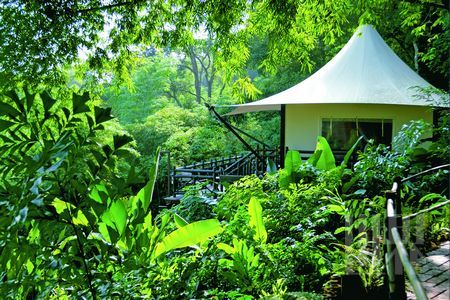 泰国的最北部与缅甸、老挝接壤,湄公河与洛克河交汇形成了一处神秘的三角地带。这里拥有原住民文化,山地民族村,神秘的古寺遗址,象夫的远古足迹,素来受到热爱探险的旅行者的喜爱。而独具匠心的金三角四季帐篷酒店便置身于这片景色的中心,不仅让客人体会到了野外生存的快乐,更带来了久违的“野餐”情趣。当我走下酒店的专车,一大片丘陵状山地就在眼前,高低起伏的地势,茂密的植被,美丽的洛克河正从酒店门前缓缓流过……想象中的完美野餐正应该发生在这样的热带丛林之中。