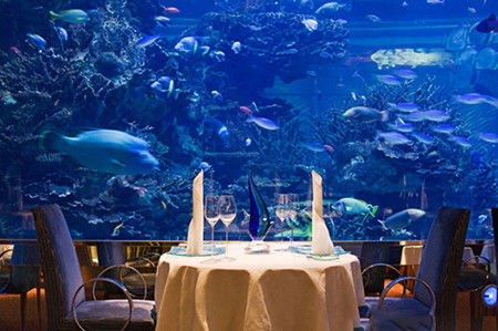 阿拉伯塔酒店是迪拜(微博)最具标志性的豪华酒店,在这里旅客能享受豪华的轿车派送、无微不至的客房服务和屋顶极致奢华的直升机之旅等酒店服务。此外,游客还能乘坐潜水艇前往酒店底层著名的水下餐厅Al Mahara,品尝其中每1.75盎司(约50克)675 美元(约合人民币4195元)的白鲟鱼子酱和价值1300美元(约合人民币8080元)的篝火鸡尾酒。