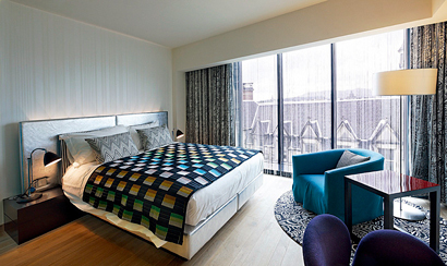 这家酒店共有129 间客房和7 间套房,每间都能够俯瞰整个爱丁堡城市和乡村风景,房间里大胆地运用了一些明亮的色彩:紫罗兰、橄榄绿、青绿色,并且通过将墙壁和天花板设计成白色从而弱化了颜色的凌乱感和强度,并给视觉留下了更多空间。