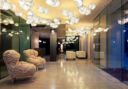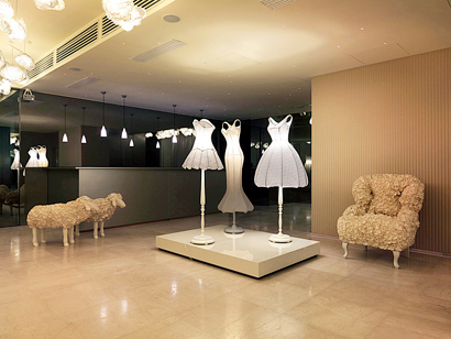 推开Maison Moschino 旅馆入口,转开前方的梦幻心形门把进入大厅,首先你会看见中央的白色梦幻洋装、贵宾狗立体灯罩,还有在两旁处蓬松云朵的折纸大灯,这里摆放了以MOSCHINO 品牌代表作—灯笼裙形状示人的灯饰,加上羊的雕塑与天花的花丛,彻底展示了其超现实主义的风格与无限的想象力。