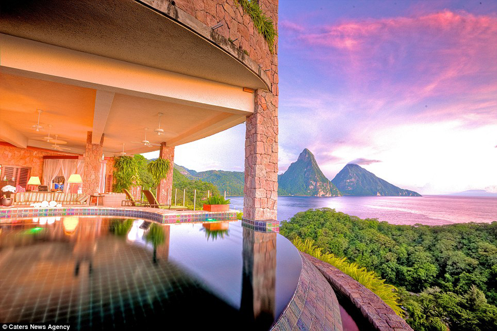 位于600英亩的圣卢西亚玉山(Jade Mountain)-安斯沙塔(Anse Chastanet)海滨度假酒店,能够同时看到 Piti 和 Gros Piton 山